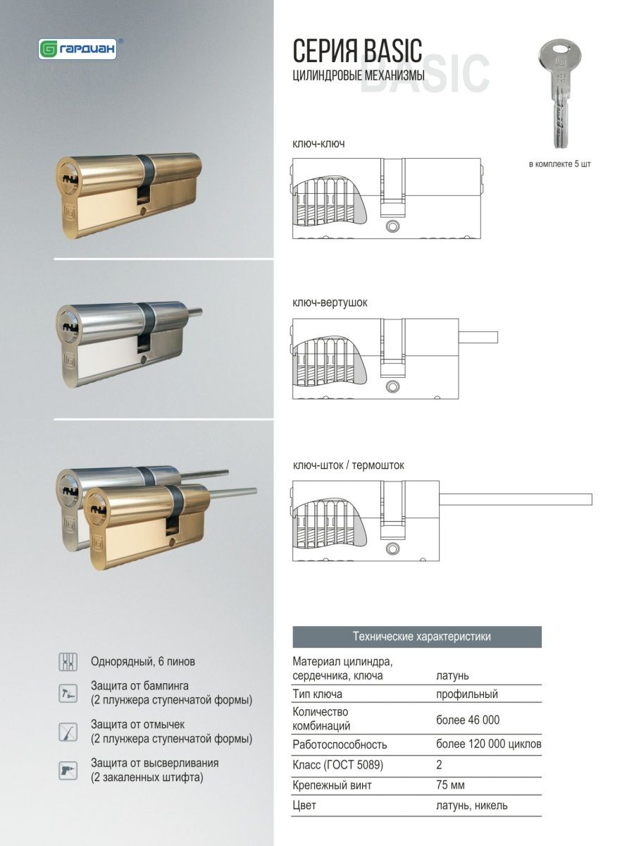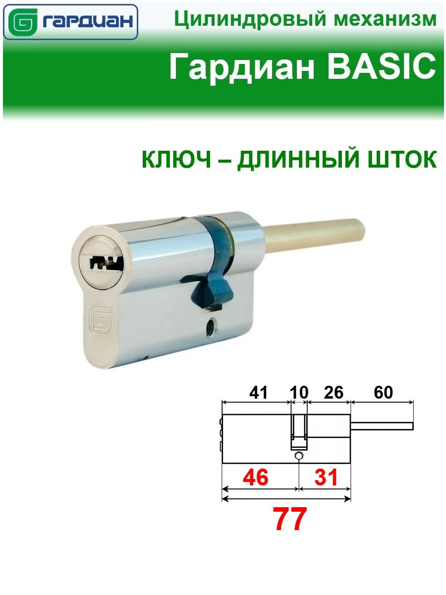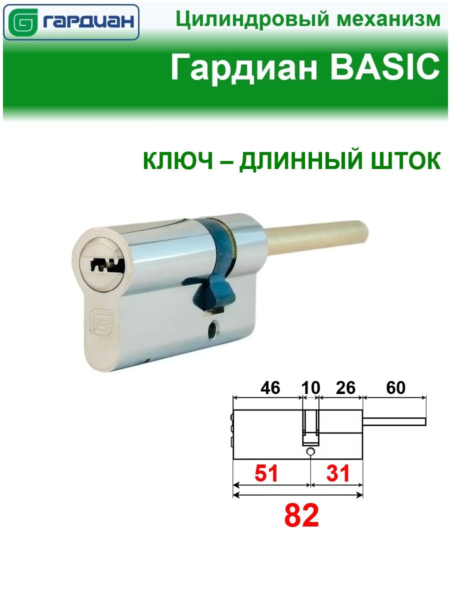 Цилиндровый механизм (личинка замка двери) Гардиан Basic (46 * 31) ключ-длинный шток изготовлен из латуни. В комплекте 5 ключей с перфорацией. Гарантия 2 года. Вертушка для цилиндра не входит в комплект и приобретается отдельно (арт. 59939076 ).
